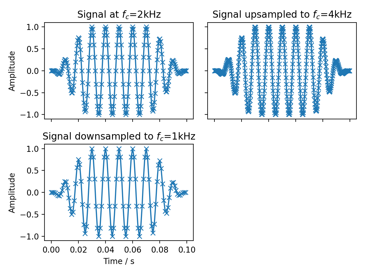 ax[0, 1].set_title('Signal upsampled to $f_c$=4kHz')